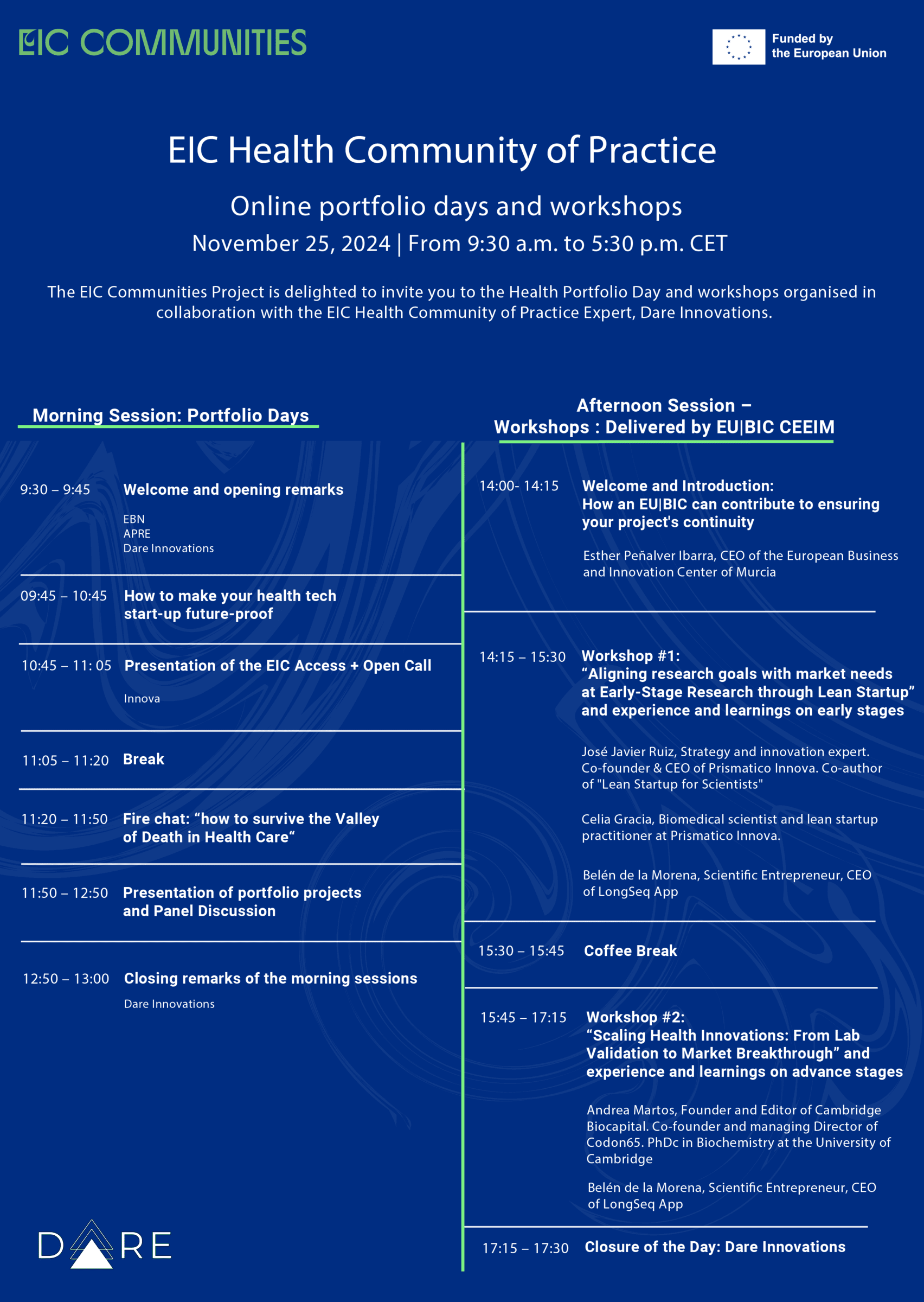On 25 November 2024, the EIC Communities project will host the Health Community of Practice Portfolio Day, in collaboration with Dare Innovations. This virtual event, running from 9:30 a.m. to 5:30 p.m. CET, will spotlight the latest advancements and challenges in health tech innovation while fostering collaboration among innovators, researchers, and stakeholders.